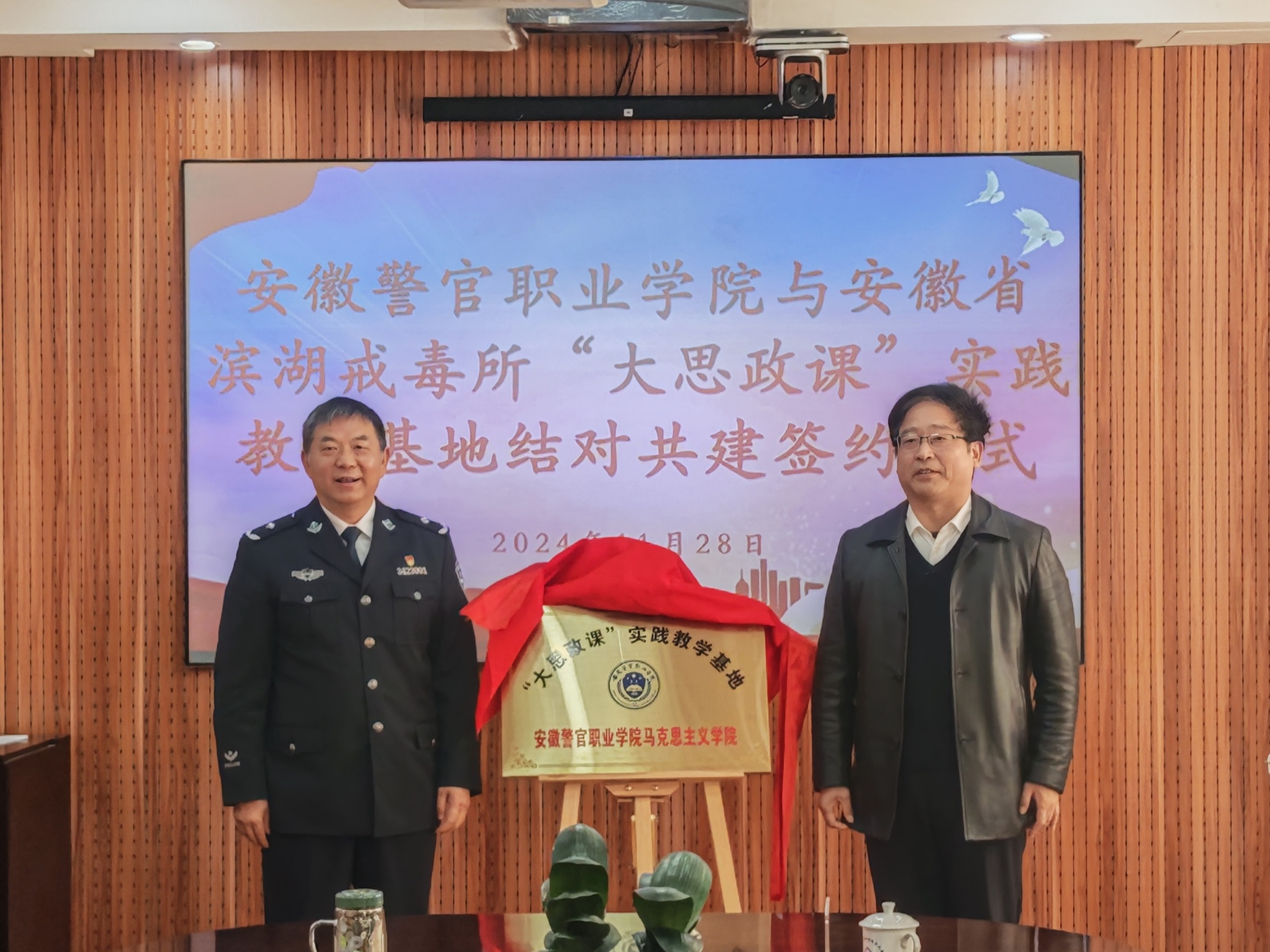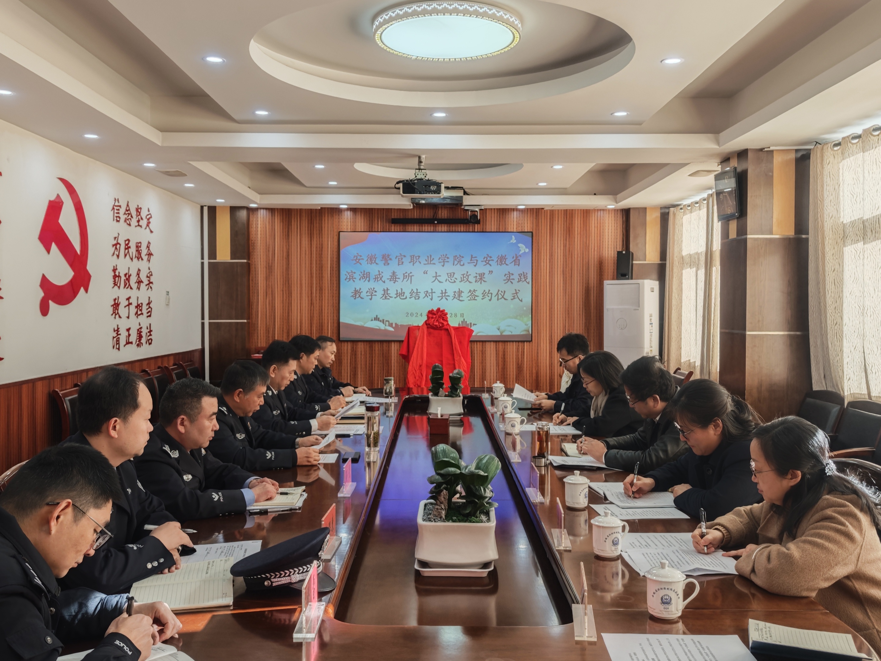 為進一步深化新時代高校思政課改革創新,充分發揮“大思政課”實踐教學基地育人功能,11月28日上午,安徽警官職業學院與安徽省濱湖戒毒所“大思政課”實踐教學基地結對共建簽約儀式在安徽省濱湖戒毒所順利舉行。安徽警官職業學院黨委委員、副院長歐元軍,安徽省濱湖戒毒所黨委書記、政委任少軍,黨委副書記、所長王衛綱、黨委委員、政治處主任孫亮等共同出席了儀式。安徽警官職業學院教務處(科研處)、組織宣傳處、馬克思主義學院相關負責同志及教師代表,安徽省濱湖戒毒所相關部門領導等參加了儀式。
