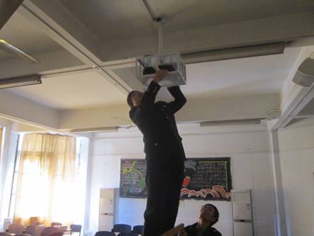 (圖為電教工作人員檢測(cè)維修投影機(jī))