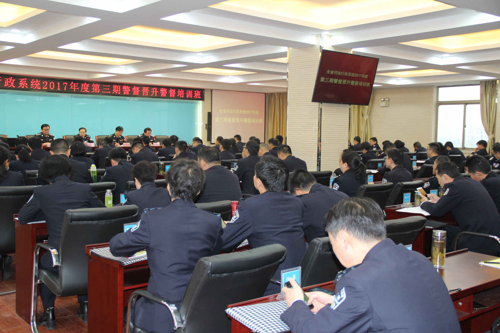 按照省司法廳政治部的部署安排,學院于3月23—4月2日承辦了為期10天的全省司法行政系統2017年度第三期警督晉升警督培訓班。來自全省司法行政系統26個單位的97名學員參加了培訓。院長胡來龍作開班致辭,副院長、紀委書記孔國荃作結業總結講話并為優秀學員和先進單位頒證頒獎。