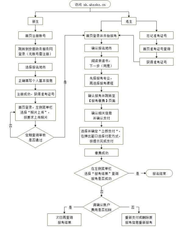 安徽省2022年10月高等教育自學考試報名工作將于9月5日9:00-9日17:00進行。報考課程選擇完成后即可網上繳費,繳費截止時間:9月9日24:00。 一、考試時間及科目 2022年10月考試時間為10月22-25日。開考科目、專業計劃、教材版本及自考政策等信息可在我院門戶網站(網址:www.ahzsks.cn)相關欄目中查詢。 二、報名網址 報名網址為http://zk.ahzsks.cn/。系統限定每位考生在整個報名期間只能報考一次(本次最多能報八門課程),考生如報考多個專業也必須一次性完成。報名采用網上繳費,繳費成功后,考生無法再進行補報、改報。報名網站不提供教材征訂服務,考生可根據我院公布的教材版本自行購買。 三、新生照片上傳 第一次參加自考的新生(或更換地市參考)通過網上直接上傳照片,具體方法是:新生在報名網站首頁注冊后,獲取準考證號,用準考證號登錄報名系統,點擊左側菜單欄的“照片上傳”,按要求上傳規定格式的照片。各市教育考試機構(自考辦)后臺審核,照片審核通過后方可選擇報考課程和繳費。 數碼照片格式為:144寬×192高像素,分辨率300dpi以上,大小在15kb,文件格式為jpg,照片為免冠、露雙耳、露雙眉正面單色背景的標準像。 由于上傳照片需要審核,建議新生在報名截止日前一天完成照片上傳,上傳后次日再次登錄查詢“照片審核結果”,審核不通過可再次上傳直至審核通過。反復多次審核不通過的可聯系報考所在市教育考試機構(聯系方式見https://www.ahzsks.cn/gdjyzxks/contactus.htm)。未成功上傳電子相片或照片審核不通過的考生,將無法完成報名。 四、特定考生報名 無二代居民身份證的港澳臺或境外人員等,首次報考時,須攜帶證件到報考所在市教育考試機構注冊,用注冊后獲得的準考證號在網上報名。有二代居民身份證件的,請直接在網上注冊報名。 公安管理學專業本科、公共安全管理專業專科為公安行業內委托開考的專業,對考生資格有嚴格要求,新生報考該專業時,須先到安徽公安職業學院進行資格審核,審核通過后由審核人將準考證號和專業進行綁定,已綁定專業的老考生和新考生即可登錄系統進行報考。 報考該專業更多信息請咨詢安徽公安職業學院繼續教育中心,電話:0551-65383293;地址:合肥市高新區望江西路559號。 監獄服刑人員第一次報考前,需由監獄管理人員到所在市教育考試機構集體注冊,取得準考證號后再通過報名網站報名;已有準考證號的監獄服刑人員可以直接報名。 服刑期滿獲釋人員若繼續參加考試,請在報考前到當地市教育考試機構更改考試地信息,然后進行網上報名。 五、其他 如有重復性扣款或已繳費且報名未成功的情況,我院會在報名結束一個月左右集中處理退款。 附件: 自考網上報名流程圖 安徽省教育招生考試院 2022年8月18日