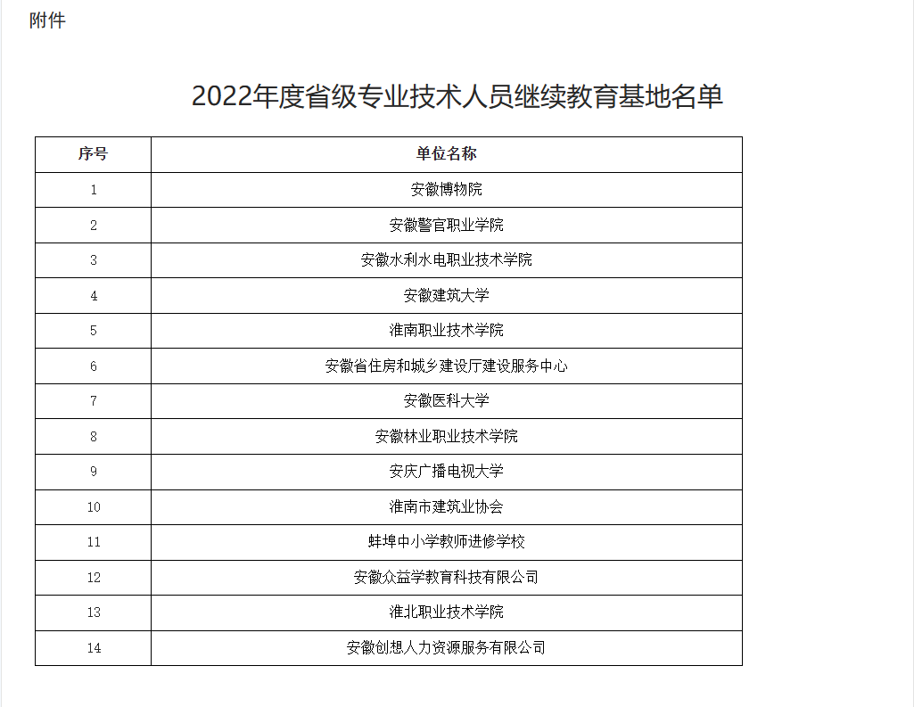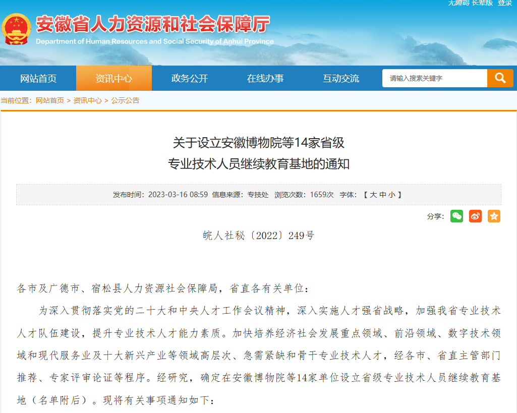 日前,安徽省人力資源和社會保障廳正式發布《關于設立安徽博物院等14家省級專業技術人員繼續教育基地的通知》(皖人社秘〔2022〕249號),我院獲評省級專業技術人員繼續教育基地。