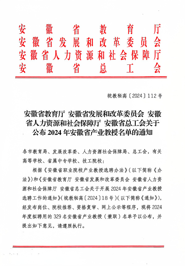 根據(jù)《安徽省教育廳安徽省發(fā)展和改革委員會安徽省人力資源和社會保障廳 安徽省總工會關(guān)于公布2024年安徽省產(chǎn)業(yè)教授名單的通知》(皖教秘高〔2024〕112號)文件精神,我院推薦申報5位兼職教師獲批安徽省高職院校類產(chǎn)業(yè)教授。