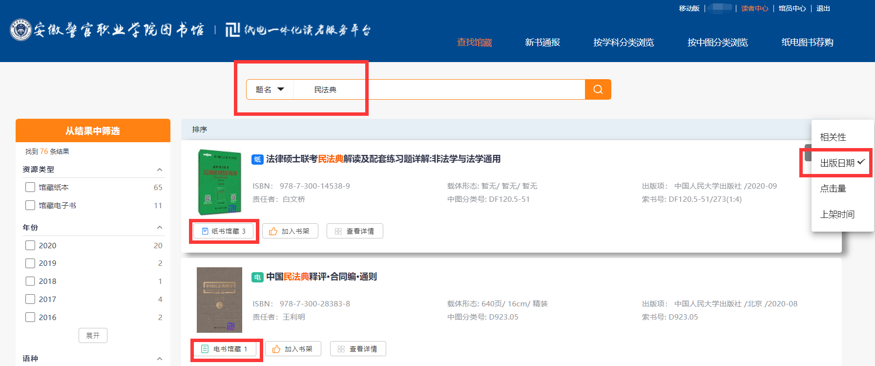 3.檢索結(jié)果界面中,可以按照“相關(guān)性”等方式對(duì)結(jié)果進(jìn)行排序,點(diǎn)擊紅框內(nèi)的紙書(shū)/電書(shū)館藏可查看該書(shū)在圖書(shū)館內(nèi)的具體信息,方便讀者到館借閱紙書(shū)或在線閱讀電子書(shū)。