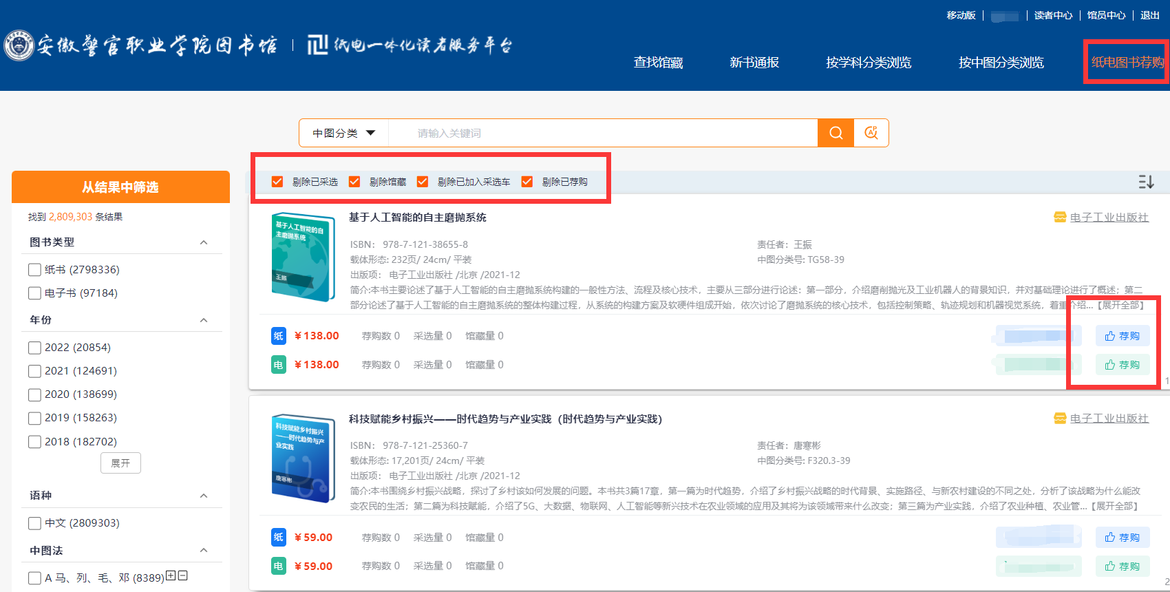 1.點(diǎn)擊“紙電圖書(shū)薦購(gòu)”進(jìn)入薦購(gòu)頁(yè)面,默認(rèn)對(duì)“剔除已采選”、“剔除館藏”等選項(xiàng)進(jìn)行勾選,根據(jù)讀者需求選擇“薦購(gòu)”紙書(shū)或“薦購(gòu)”電子書(shū)。