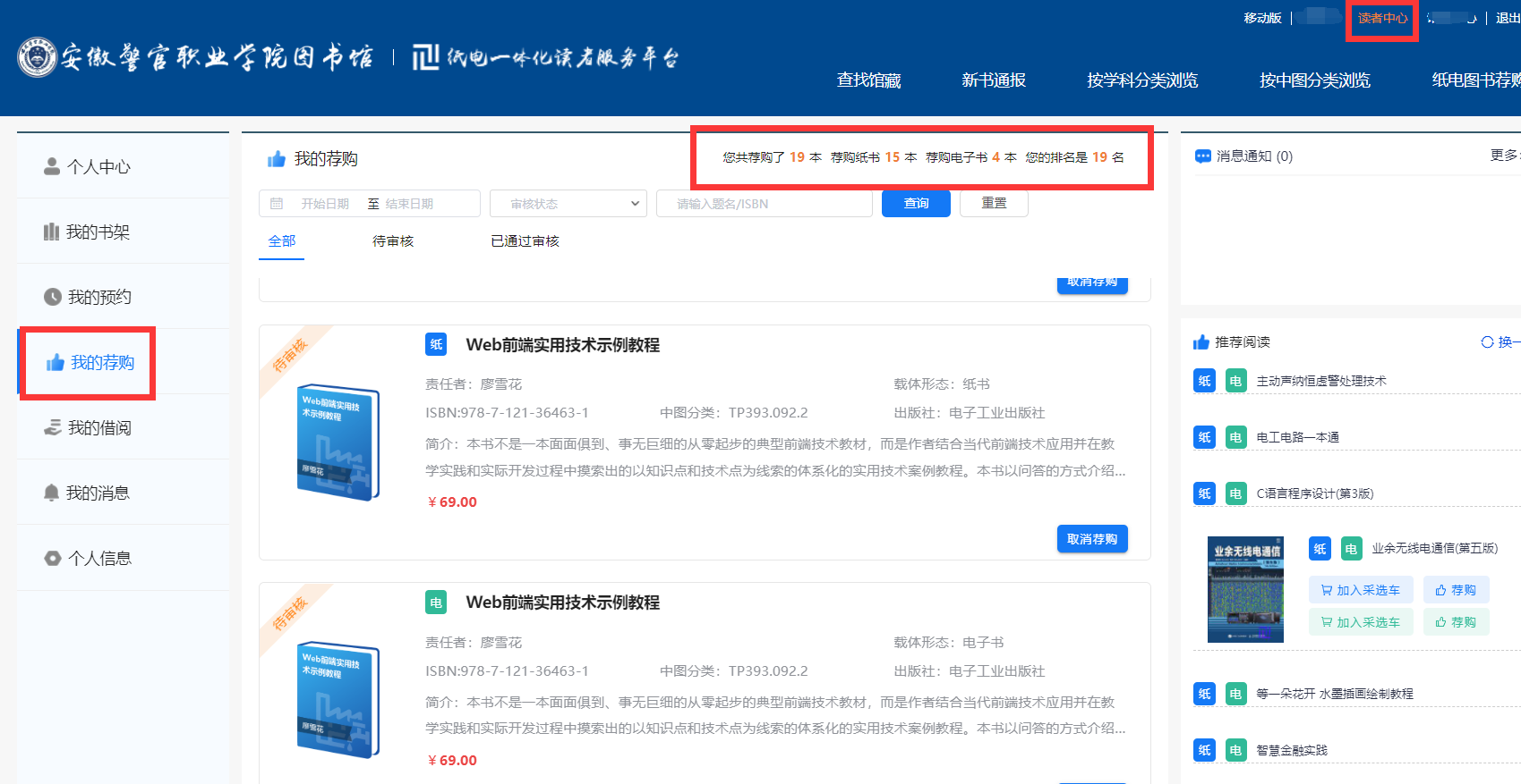 2.點(diǎn)擊“讀者中心”,進(jìn)入“我的薦購(gòu)”界面,即可查詢個(gè)人薦購(gòu)情況。