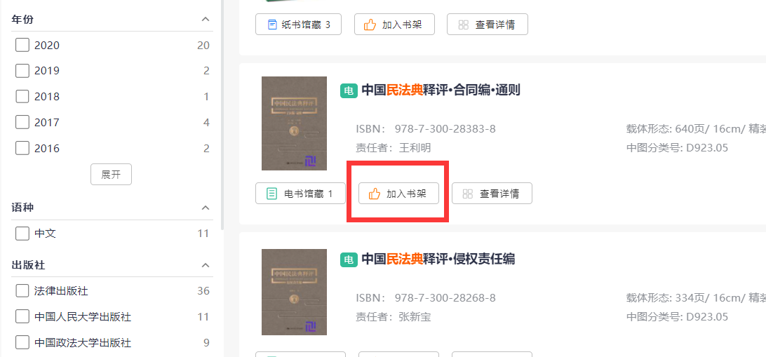 4.檢索到的圖書(shū)可以“加入書(shū)架”,隨后在“讀者中心”欄目下的“我的書(shū)架”進(jìn)行查閱。