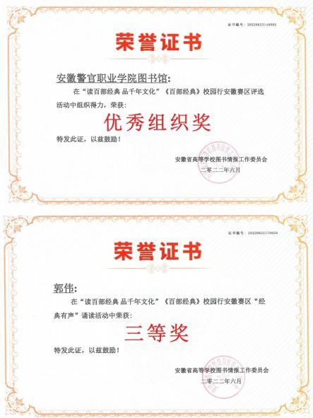 為響應國家圖書館、中國圖書館學會《中華傳統(tǒng)文化百部經(jīng)典》校園行活動,安徽省高校圖工委于2021年12月15日至2022 年4月30日開展安徽賽區(qū)評選活動,我院圖書館積極響應,精心組織,在此次評選活動中榮獲優(yōu)秀組織獎,我院基礎部郭偉老師在“經(jīng)典有聲”原著誦讀展示活動中榮獲三等獎。