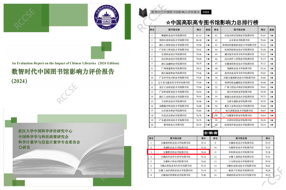 日前,武漢大學(xué)中國科學(xué)評價(jià)研究中心、中國科學(xué)學(xué)與科技政策研究會科學(xué)計(jì)量學(xué)與信息計(jì)量學(xué)專業(yè)委員會聯(lián)合發(fā)布《數(shù)智時(shí)代中國圖書館影響力評價(jià)報(bào)告(2024)》,對我國2820所普通高校圖書館(包括1545所高職高專院校圖書館)進(jìn)行評價(jià)。學(xué)院圖書館被評為“五星圖書館”(同類型圖書館排名前10%授予“五星圖書館”榮譽(yù)稱號,為具有突出影響力單位),在中國高職高專圖書館影響力總排行榜中位列第58名,在安徽省高職高專圖書館中位列第3名。