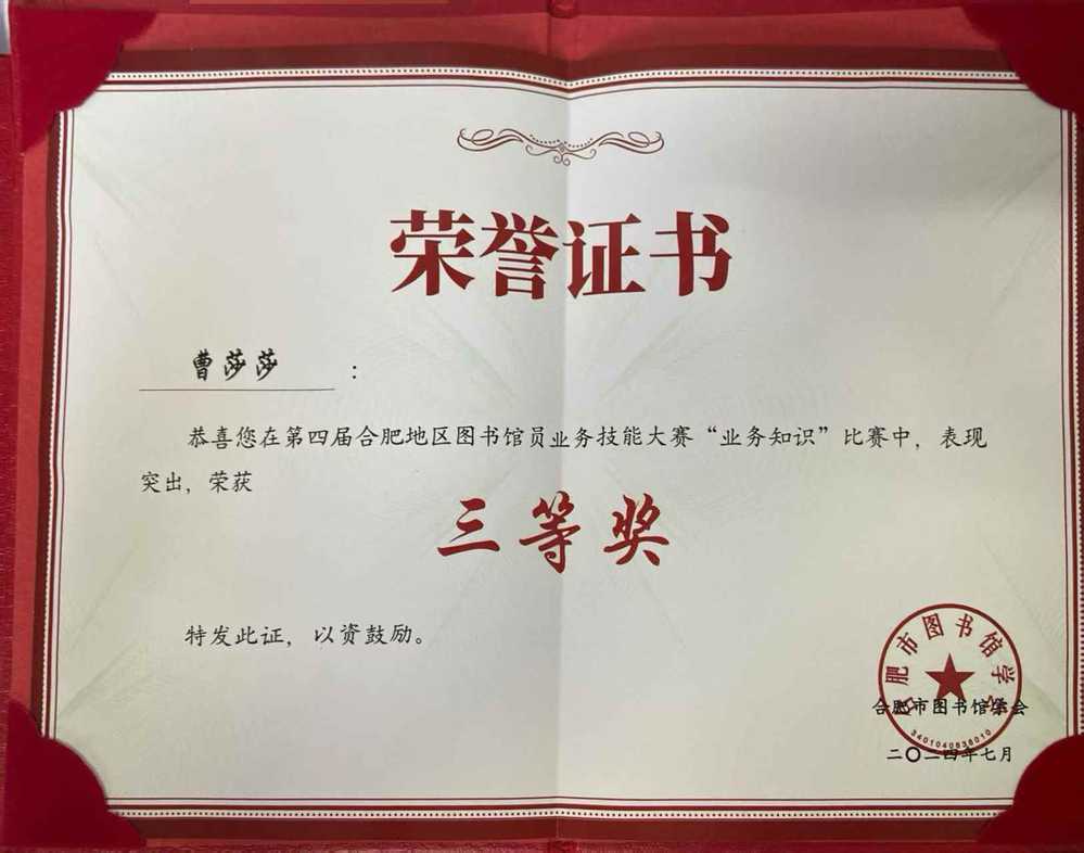 近日,我院圖書館館員曹莎莎在第四屆合肥地區圖書館員業務技能大賽中表現卓越,榮獲“業務知識”比賽三等獎及“著錄”比賽二等獎,彰顯了我院圖書館員的專業素養與綜合實力。