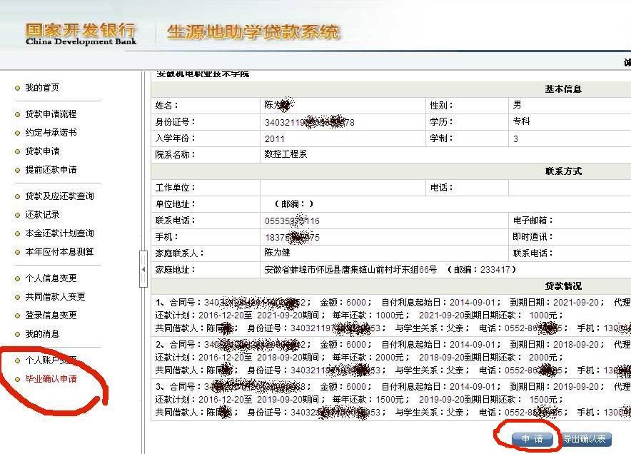 (2)借款學(xué)生申請畢業(yè)確認。學(xué)生登錄國家開發(fā)銀行學(xué)生在線服務(wù)網(wǎng)站(https://sls.cdb.com.cn),核對個人和共同借款人信息是否與目前信息一致,如不一致,需更新為最新信息,同時補全就業(yè)單位等其他信息。信息更新完畢后,發(fā)起“畢業(yè)確認”申請;