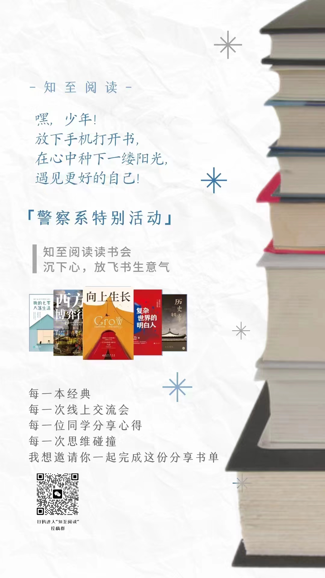 為營造閱讀氛圍,養成閱讀習慣,警察系團總支宣傳部、學生會學習部自2023年12月起,在“安徽警院警察系”微信公眾號上面向全體師生,推出“知至閱讀”讀書分享專欄。稿件內容是一本正在閱讀的枕邊書,包括書名、作者及推薦的理由,分享書中最喜歡的一段文字。稿件要求為原創作品,內容健康,鼓勵以“警”字為特色;體現訓詞精神,貼合校園實際生活。活動對投稿發表者發放精美紀念品。