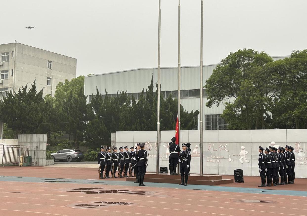 活動開始前,參加升國旗儀式的學(xué)生,身著警服,軍姿挺拔,即將共同見證五星紅旗冉冉升起的莊嚴(yán)時刻,展現(xiàn)了公共管理系學(xué)生良好的精神風(fēng)貌。6時47分,軍樂團演奏完《歌唱祖國》后,伴隨著鏗鏘有力、整齊劃一的腳步聲,學(xué)院國旗護(hù)衛(wèi)隊氣宇軒昂走向國旗臺。“向國旗——敬禮!”6時50分,莊嚴(yán)的《義勇軍進(jìn)行曲》響起,掌旗員奮力揮動右臂,鮮艷的五星紅旗冉冉升起。在場全體人員向國旗敬禮,齊聲高唱國歌,本次升國旗儀式圓滿結(jié)束。