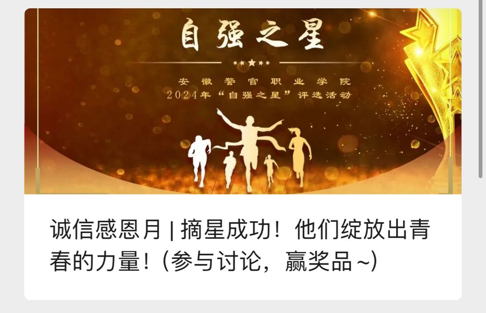 為進一步推進大學生思想引領和青年典型培育工作,引導和激勵家庭經濟困難學生逆境拼搏、自立自強、奮發成才,學院深入挖掘優秀學生典型,開展“勵志青春 自強人生”2024年學院大學生“自強之星”評選活動,在學院范圍內選樹法律一系宋佳等6位“自強之星”,為廣大青年學子樹立了可親、可信、可學的良好榜樣。同時,結合評選活動,開展學生先進典型系列宣傳,編發微信推文在“青春安警院”微信公眾號推送,開設“對話榜樣”欄目,讓學生以“自強之星”為榜樣,圍繞青年學子如何“立大志、明大德、成大才、擔大任”展開討論。