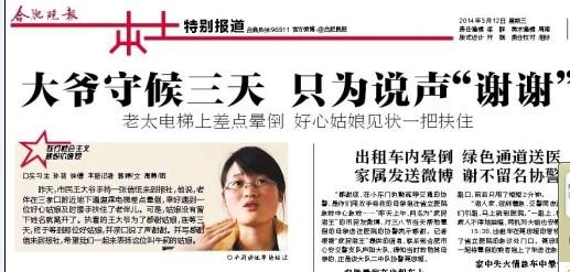 3月12日,合肥晚報第七版特別報道的頭條“大爺守候三天 只為說聲謝謝”,此報道一經(jīng)發(fā)表,迅速被新華網(wǎng)、搜狐滾動、安徽好人網(wǎng)、大公資訊、新安晚報及各省網(wǎng)絡(luò)新聞媒體轉(zhuǎn)載,鋪天蓋地的鮮花與掌聲隨之而來......不過,最讓人欣喜的是這位好人竟然是警院學(xué)子——信息管理系11級法制新聞專業(yè)學(xué)生牛莉。