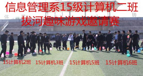 發揚團隊精神,增強班級凝聚力,促進各班級之間的交流、豐富同學們的興趣生活,2016年4月18日下午,15計算機二班,邀請了15計算機三班、15計算機五班、15計算機六班。在學院體育場舉行了一場別開生面的拔河比賽和興趣游戲活動。我們還邀請了聯系班級領導,后勤集團任建偉書記,系領導學生科老師和班主任。