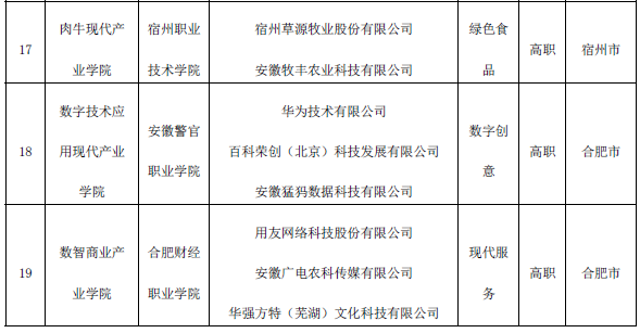 近年來,學院高度重視校企合作,不斷改革創(chuàng)新,持續(xù)推進產(chǎn)教融合。2023年底,學院根據(jù)省教育廳印發(fā)的《安徽省教育廳關于開展2023年省級現(xiàn)代產(chǎn)業(yè)學院申報建設工作的通知》(皖教秘高〔2023〕177 號),積極行動,聯(lián)合華為技術有限公司、百科榮創(chuàng)(北京)科技發(fā)展有限公司、安徽猛犸數(shù)據(jù)科技有限公司聯(lián)合申報了數(shù)字技術應用現(xiàn)代產(chǎn)業(yè)學院,經(jīng)過激烈角逐,從全省近160所申報院校中脫穎而出,成功獲批。