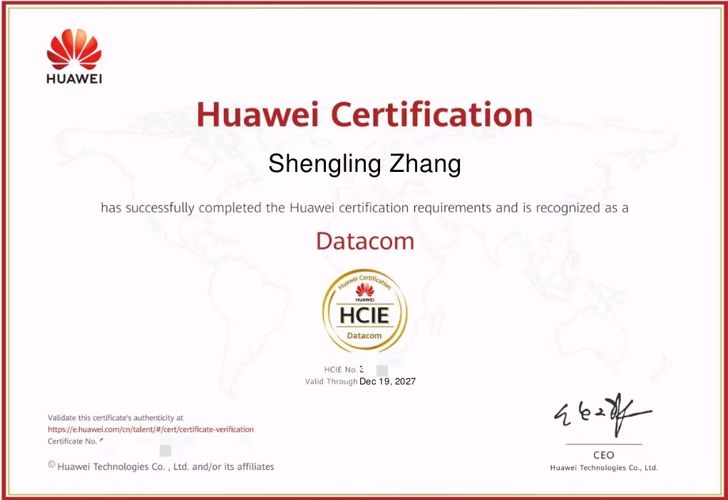 2024年12月20日,信息管理系網絡工程專業學生張升領在信息技術領域中取得了一項令人矚目的成就——他順利通過了華為最高級別的HCIE(Huawei Certified ICT Expert)認證考試。這一輝煌成績實現了我院學生HCIE認證的零的突破,不僅標志著張升領同學在ICT領域的專業技能達到了業內先進水平,彰顯了信息管理系在培養高素質信息技術人才方面的整體卓越成效,更是我院省級現代產業學院產教融合共建專業的標志性實踐成果。