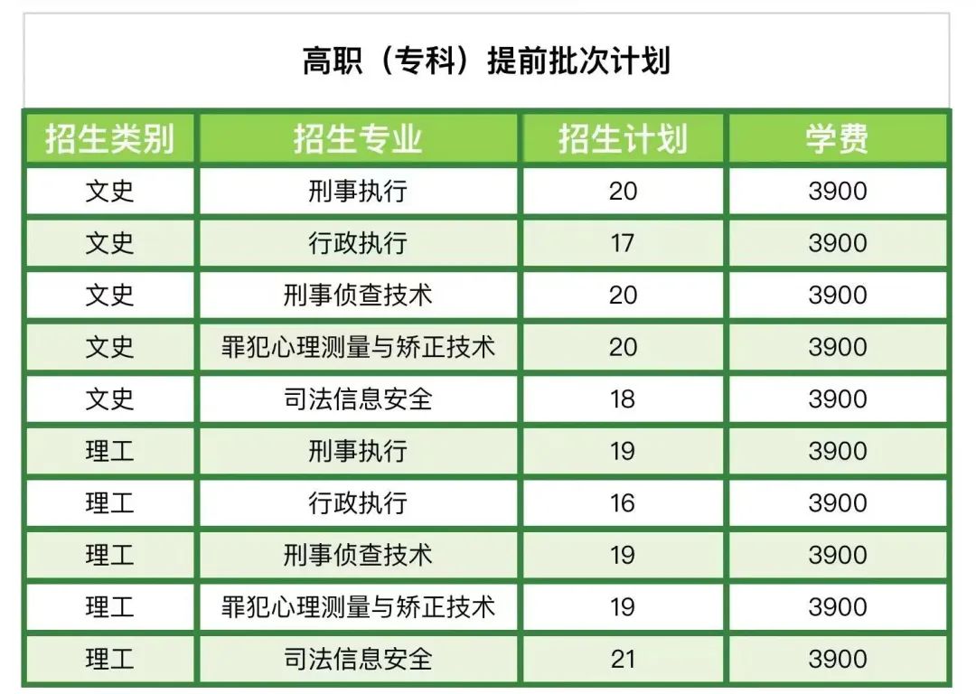 法律事務 、知識產權管理、社區矯正 、法律文秘 、社區管理與服務、司法警務、心理咨詢 、建筑消防技術 、司法鑒定技術、大數據與會計、會計信息管理、國際經濟與貿易 、勞動與社會保障、行政管理、計算機網絡技術、現代物流管理 、大數據技術、商務數據分析與應用、新聞采編與制作、應用英語、司法信息技術 、人工智能技術應用、黨務工作。