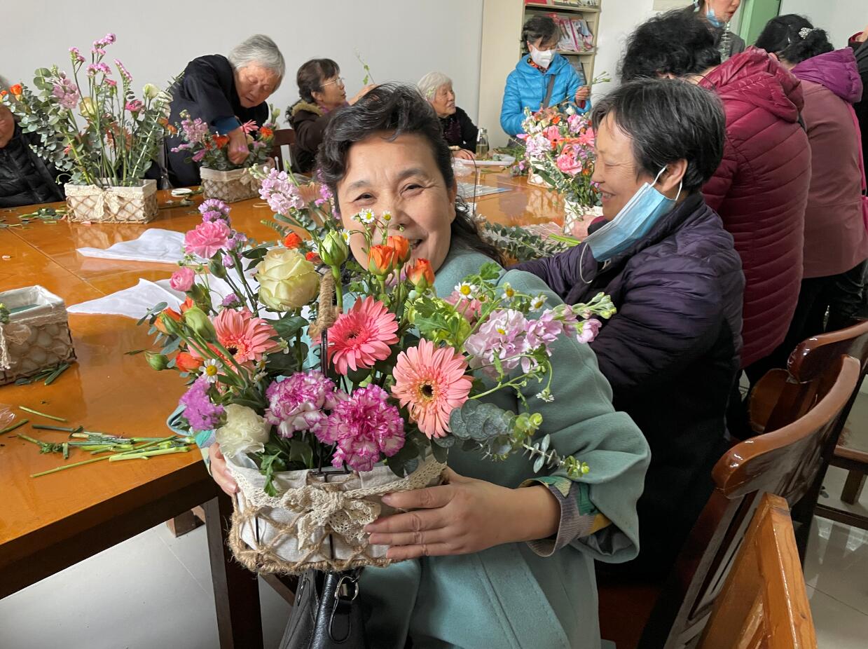 活動現場,老同志們聚精會神地聽取花藝師對插花器具、花材種類、插花順序以及造型設計等知識的講解,在花藝師現場演示和指導下,老同志們興致勃勃地邊學邊做,每個人憑借著對美的理解與欣賞,用手中的一花一草插出一籃籃錯落有致、造型各異、色彩鮮艷的作品,面對自己的插花作品,老同志的臉上洋溢出幸福的笑容,紛紛與自己的作品合影留戀,記錄下這美好的瞬間,現場氣氛溫馨而熱烈。