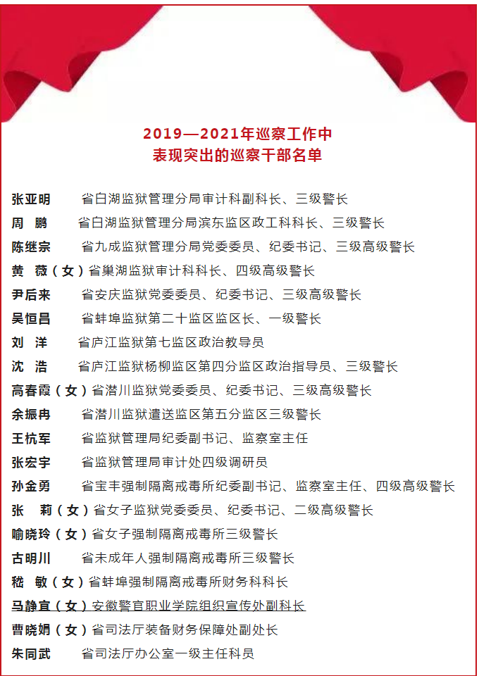 為鼓勵先進、樹立典型,發揮標桿引領作用,日前,省司法廳發布《關于表揚在2019—2021年巡察工作中表現突出的巡察干部的通報》,決定對張亞明等20名在2019—2021年巡察工作中表現突出的巡察干部予以通報表揚,我院巡察干部馬靜宜獲通報表揚!