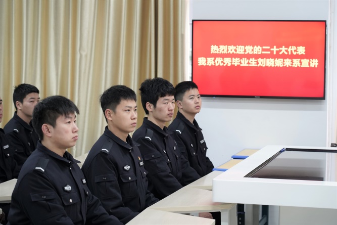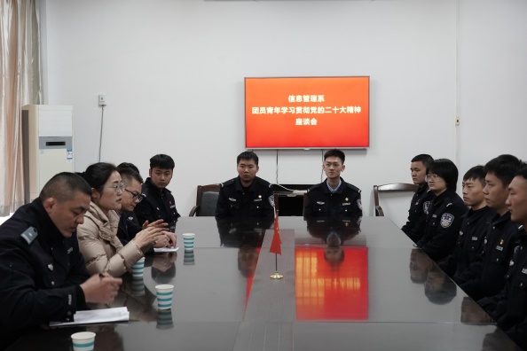 專題宣講前,劉曉妮來到學院信息管理系,參加團員青年學習宣傳貫徹黨的二十大精神座談會,與警院青年學生進行面對面互動交流,分享自己關于黨的二十大精神的深刻體會、參會見聞以及基層工作經歷,并現場解答學弟學妹們提出的有關問題。劉曉妮在交流中勉勵警院青年們要勇于擔當時代重任,把自身遠大理想同黨的路線方針結合起來,腳踏實地、磨練本領、埋頭苦干,在全面建設社會主義現代化國家新征程上拿出新時代青年人的朝氣、勇氣、志氣、底氣,挺膺擔當,激揚青春,在全面建設社會主義現代化國家新征程上唱響青春之歌。