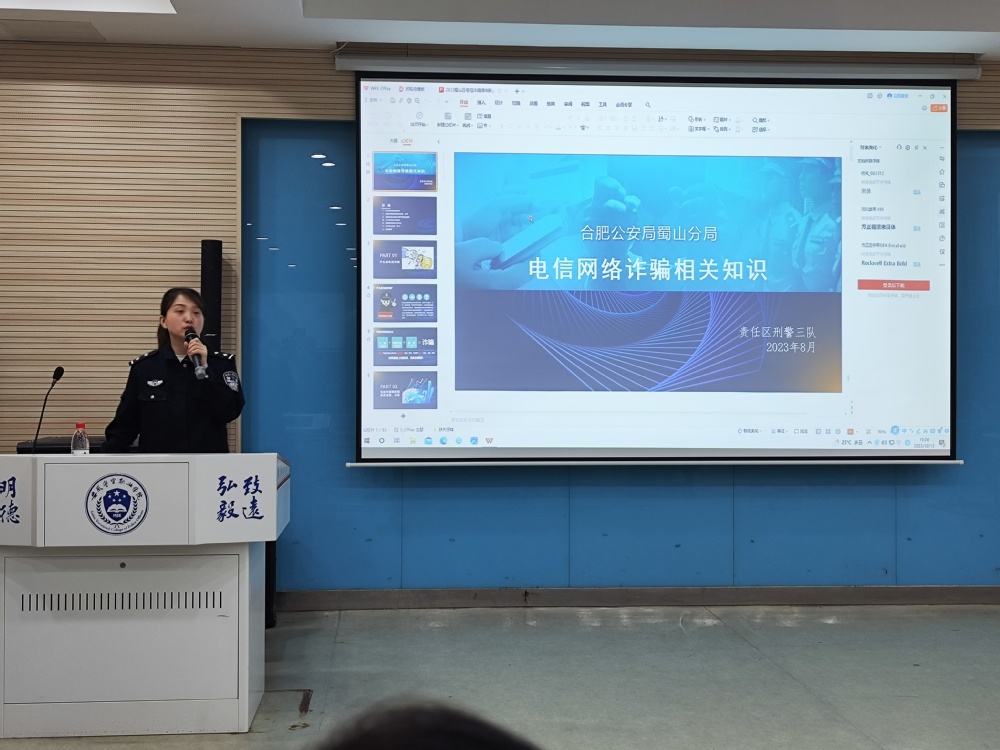 十月金秋敬老月,筑牢反詐防護線。為切實增強老年群體的法律意識和反詐水平,依法維護老年人合法權益,10月13日下午,學院開展“反詐防騙,敬老助老”主題活動,邀請合肥市蜀山區公安局刑警大隊燕警官、五里墩派出所李警官來院為我院離退休老同志開展《遠離電信網絡詐騙》專題講座,40多位老同志到會聆聽。