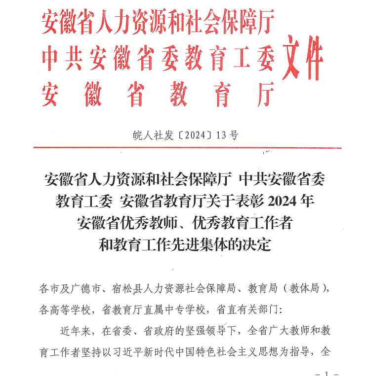 近日,省人力資源社會保障廳、省委教育工委、省教育廳發文,表彰了全省優秀教師、優秀教育工作者和教育工作先進集體。學院信息管理系榮獲“安徽省教育工作先進集體”稱號,學院馬克思主義學院教師劉輝榮獲“安徽省優秀教師”稱號。